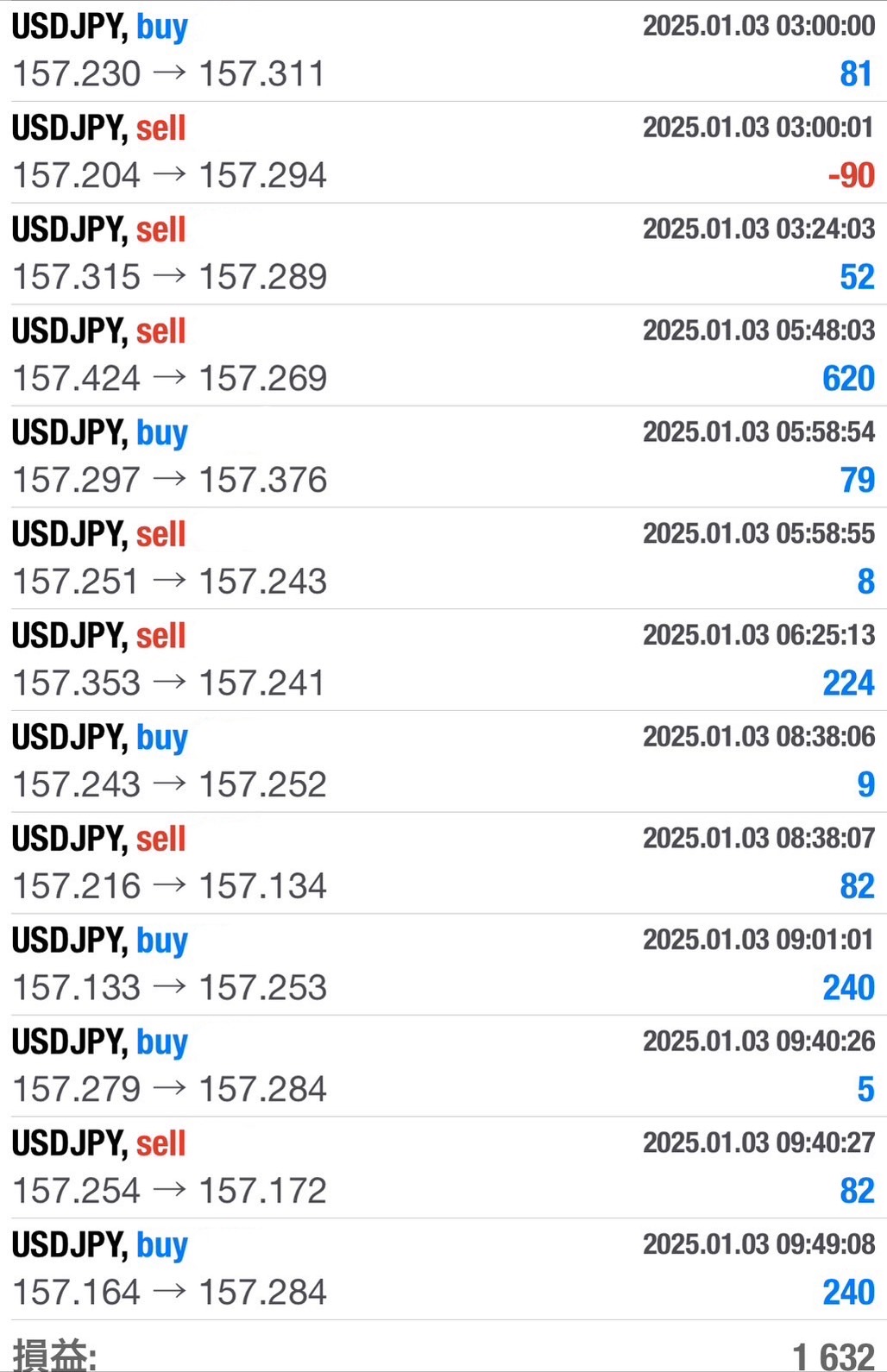 2025-01-03(USDJPY) トレード結果 Twitter Facebook はてブ Pocket LINE コピー 2025.01.03 本日のドル円結果、10時~17時設定、EA自動売買ONにてトレード、17時15分利確 ^^/ +1,632 日足チャートは、9日転換線に下値が押し戻されての横這い状態、更に上値を追いそうだが、 もうすぐトランプ大統領就任!持越しせずに日計りトレードで