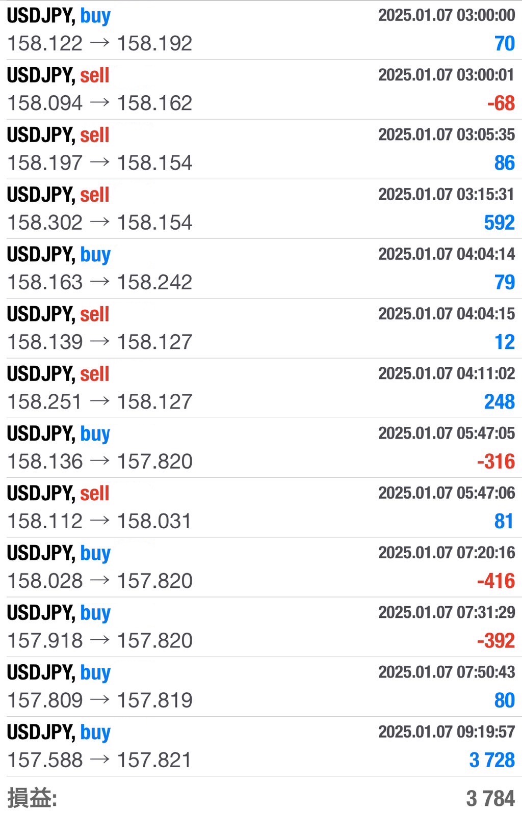 2025-01-07(USDJPY) トレード結果 Twitter Facebook はてブ Pocket LINE コピー 2025.01.07 本日のUSDJPY設定10時~17時、残ポジション利確に時間がかかった・・20時17分利確 +3,784 (^^)/ 本日ドル円とGOLD合計損益+6,135