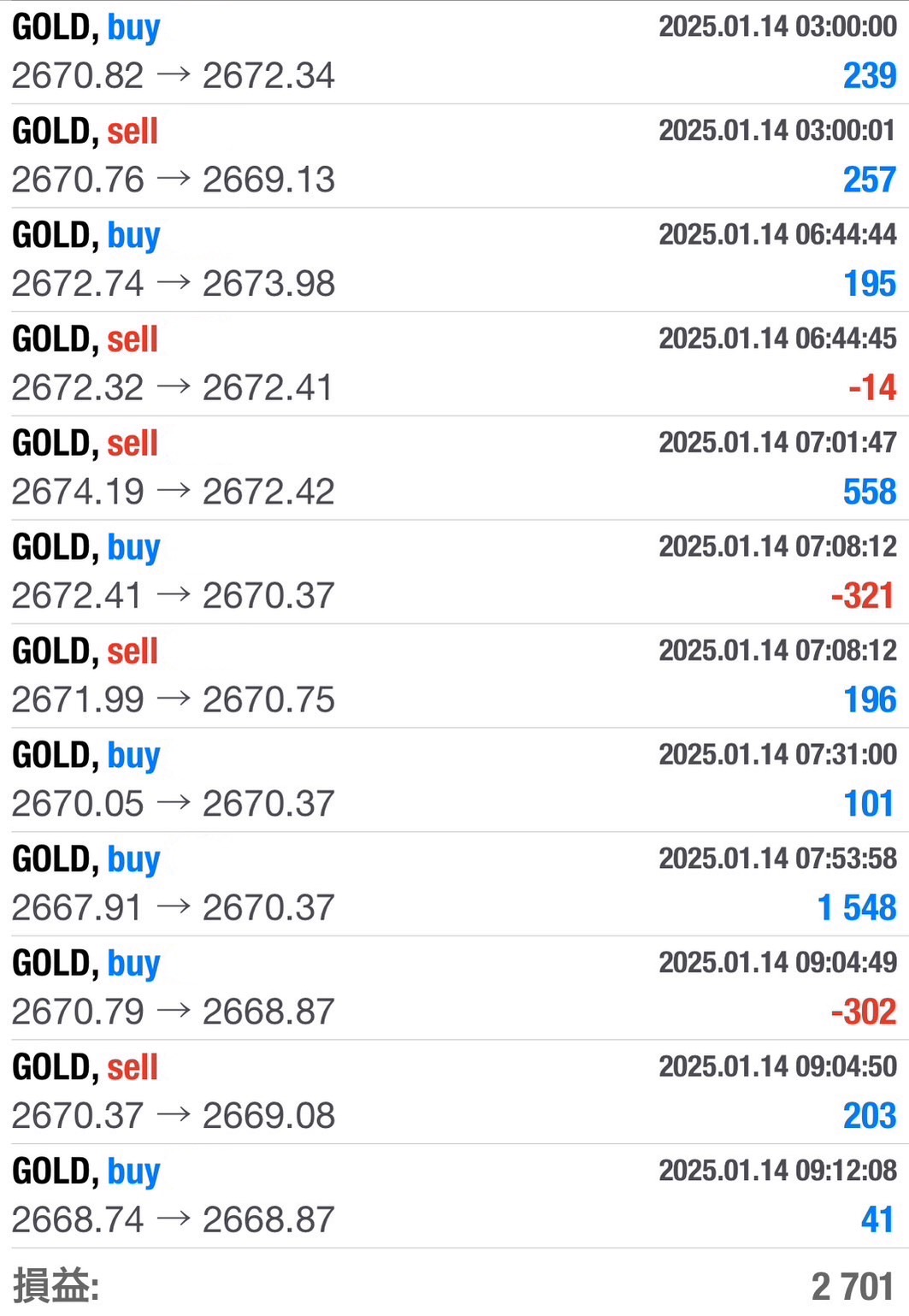 2025-01-14(GOLD) トレード結果 Twitter Facebook はてブ Pocket LINE コピー 2025.01.14 本日あまり相場が動かなった、10時~17時設定だっあのですがポジションが少し残っていたところ、 急な予定が入り画面が見れないところ、少数ポジションだったので一括決済ボタンで利益確定 +2,701