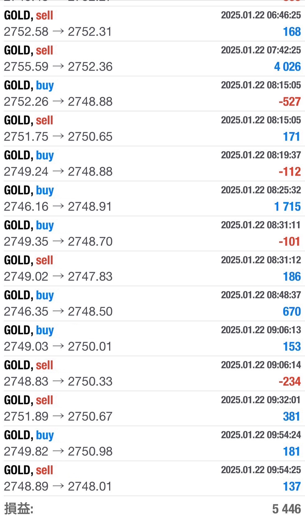2025-01-22(GOLD) トレード結果 Twitter Facebook はてブ Pocket LINE コピー 2025.01.22 本日のGOLD結果、日足チャートが上昇傾向だったので、値幅を縮小して⑽時~17時設定での自動トレード +5,446 ^^