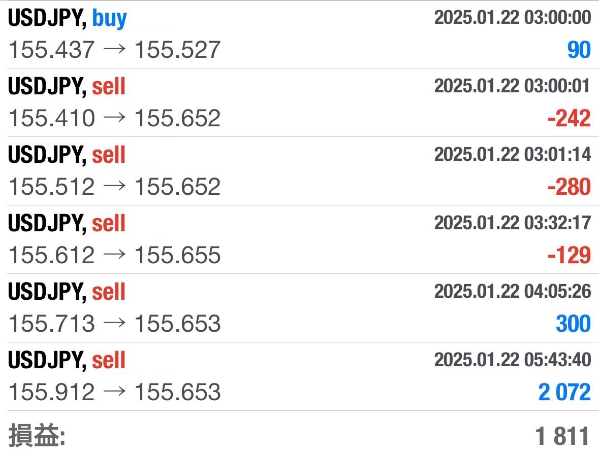 2025-01-22(USDJPY) トレード結果 Twitter Facebook はてブ Pocket LINE コピー 2025.01.22 本日のUSDJPY結果、10時~17時設定、日銀の利上げ、米経済指数発表によるアメリカの利下げ据置観測、米大統領アメリカファースト発言等で相場が荒れ模様。。今日は少し様子見ムードか・・利益確定幅は薄めの結果 +1,811 ^_^